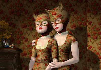 "I was born in London, England on October 26 1958, the youngest of four and much to my parent's surprise, I was born a dog. This unfortunate turn of events was soon accepted within my family and was never again mentioned in the presence of police company."Ray Caesar est donc un chien, mais un chien qui sait drôlement bien se servir de sa palette graphique. D'une raideur et d'une méticulosité presque inquiétantes, ses Marie-Antoinette diaphanes n'ont pas la sérénité d'une Kirsten Dunst en crinoline. Moitié chattes, moitié pieuvres, moitié perverses, moitié cascadeuses.